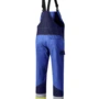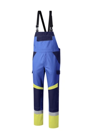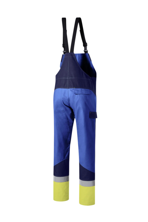 Dreifarbig, seitliche Stretcheinsätze, Druckknöpfe im Schlitz, verstellbaren Stretchträger mit Fixlockschnallen, Latztasche mit Patte und verdeckten Druckknöpfen, seitliche Eingrifftaschen mit Blende und verdecktem Druckkopf, Pattentasche auf linkem Oberschenkel und rechte doppelte Zollstocktasche mit Patte und verdeckten Druckknöpfen, innenliegende Knietaschen mit Kontrasteinsatz oberhalb der rechten und linken Knietasche und kontrastfarbiger Beinabschluss als Erkennungsmerkmal der Sicherheitsstufe „heavy+“, Reflexstreifen unterhalb der Knietasche, rechte Gesäßtasche mit Patte und verdecktem Druckknopf, Vorderhose zweilagig.