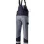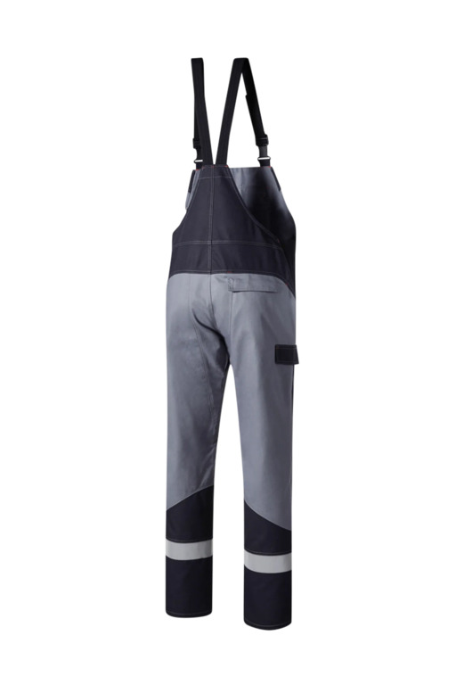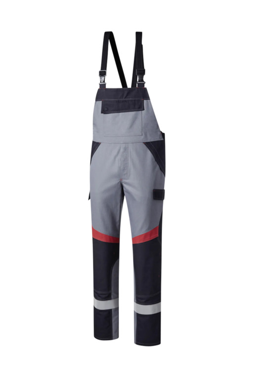 Dreifarbig, seitliche Stretcheinsätze, Druckknöpfe im Schlitz, verstellbaren Stretchträger mit Fixlockschnallen, Latztasche mit Patte und verdeckten Druckknöpfen, seitliche Eingrifftaschen mit Blende und verdecktem Druckkopf, Pattentasche auf linkem Oberschenkel und rechte doppelte Zollstocktasche mit Patte und verdeckten Druckknöpfen, innenliegende Knietaschen mit Kontrasteinsatz oberhalb der rechten und linken Knietasche als Erkennungsmerkmal der Sicherheitsstufe „heavy“, Reflexstreifen unterhalb der Knietaschen, rechte Gesäßtasche mit Patte und verdecktem Druckknopf.
