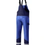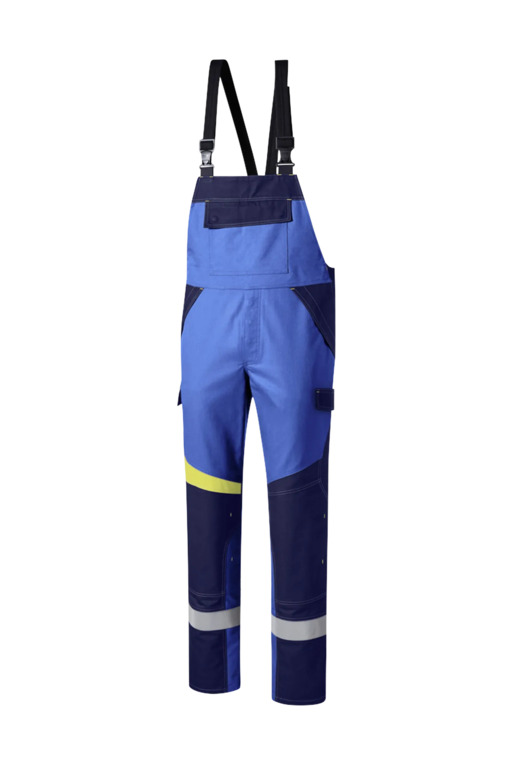 Dreifarbig, seitliche Stretcheinsätze, Druckknöpfe im Schlitz, verstellbaren Stretchträger mit Fixlockschnallen, Latztasche mit Patte und verdeckten Druckknöpfen, seitliche Eingrifftaschen mit Blende und verdecktem Druckkopf, Pattentasche auf linkem Oberschenkel und rechte doppelte Zollstocktasche mit Patte und verdeckten Druckknöpfen, innenliegende Knietaschen mit Kontrasteinsatz oberhalb der rechten Knietasche als Erkennungsmerkmal der Sicherheitsstufe „light“, Reflexstreifen unterhalb der Knietaschen, rechte Gesäßtasche mit Patte und verdecktem Druckknopf.