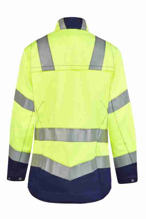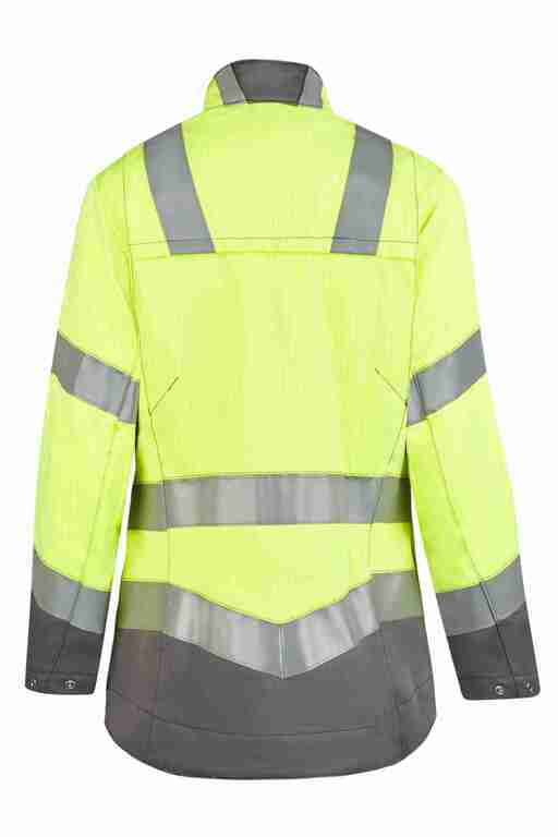 Stehkragen, vordere Mitte mit Reißverschluss und Druckknöpfen, 2 Brusttaschen mit Patte und Druckknopf, Ärmelabschluss weitenverstellbar durch Druckknöpfe, 2 Seitentaschen mit Reißverschluss, Bewegungsfalten im Rückenteil, verlängerter Rücken, 2 Brustinnentaschen mit Klett, zusätzlich 2 große Innentaschen, 50mm Reflexstreifen um Rumpf, Ärmel und über Schulter, 25mm Reflexstreifen am hinteren Kragen.