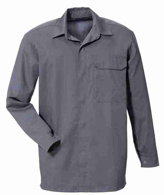 Umlegekragen, vordere Mitte mit Druckknöpfen, links Brusttasche mit Patte und Druckknopf, Ärmelabschluss weitenverstellbar durch Druckknöpfe, Proban®. Eigenschaften:krumpfarm, Proban® Soft mit weichem Griff, atmungsaktiv, dauerhaft flammbeständig bei Einhaltung der Waschvorschrift auch nach 50 Wäschen, sehr hohe Farbechtheit, hautfreundlich (Öko-Tex Standard 100 Produktklasse II). Anwendungsgebiete:bei Energieversorgern, im Niederspannungsbereich, wie bspw. Hausanschlusskästen, Ortsnetzstationen, für Arbeiten von unter Spannung stehenden Teilen, Gasversorgungsbetrieben, pyrotechnische Industrie, in der Chemieindustrie, in explosionsgefährdeten Bereichen, Transportunternehmen mit Explosivstoffen, bei Verkehrsbetrieben, im Schiffbau, für intensive Schweißarbeiten, Feuerwehrbekleidung, Industriearbeiterbekleidung, Maschinen- und Anlagenbau.