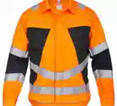 Polokragen mit Knopfleiste, Kurzarm, Ärmelabschluss mit elastischem Bündchen, 50mm segmentierte Reflexstreifen (dehnbar) um Rumpf und über Schultern.